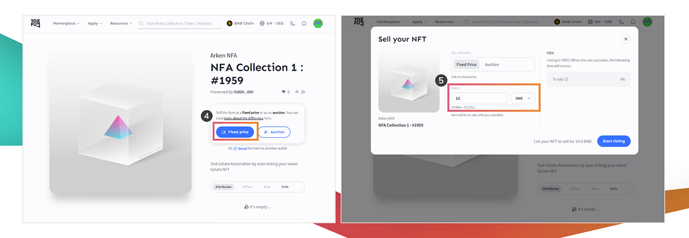 You can either choose ‘Fixed Price’ option or ‘Auction’ option for your NFA listing. Put in the price you wish to sell. Then ‘Start listing’.