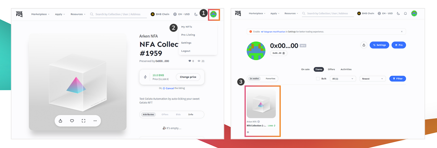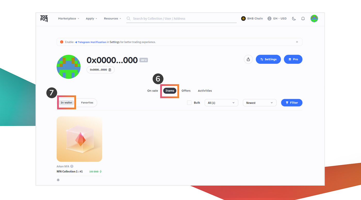 Once confirmed, the purchased NFA will appear on your Profile Page. Click on ‘Item’ tab and ‘In wallet’ tab to find your NFA.