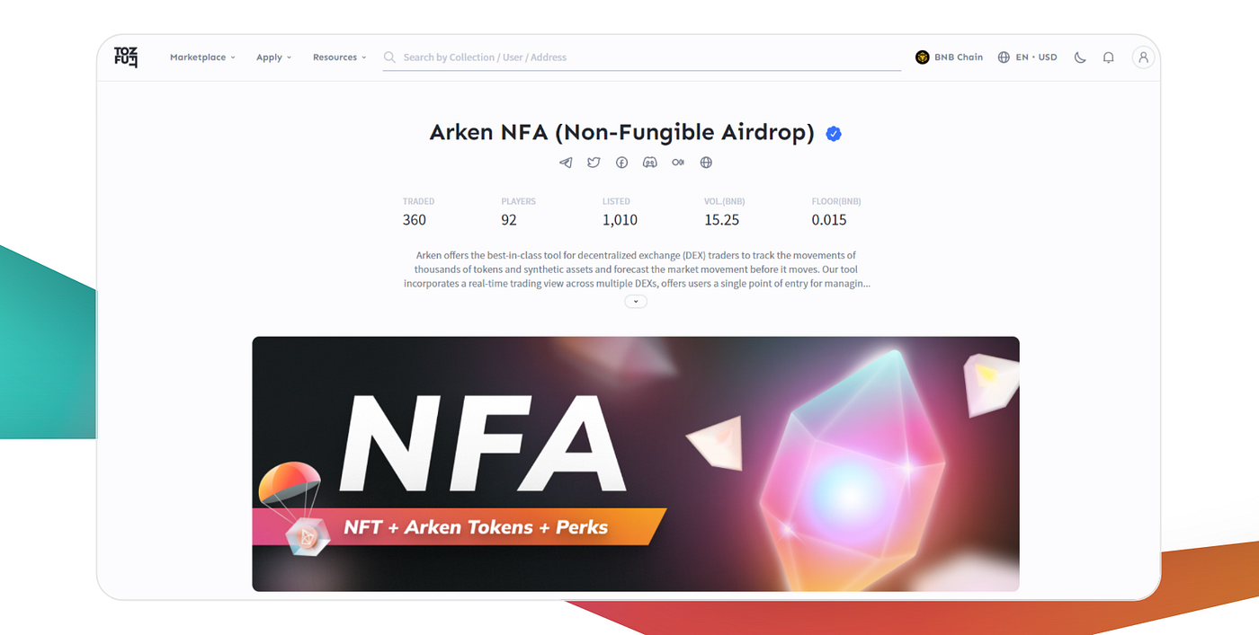 You can sell your NFA on any NFT Marketplace. However, Arken Finance recommends the TofuNFT specifically, as we have set up an official account for NFA Collection 1 on there for you. Visit Arken NFA (Non-Fungible Airdrop)’s Official Account on TofuNFT.