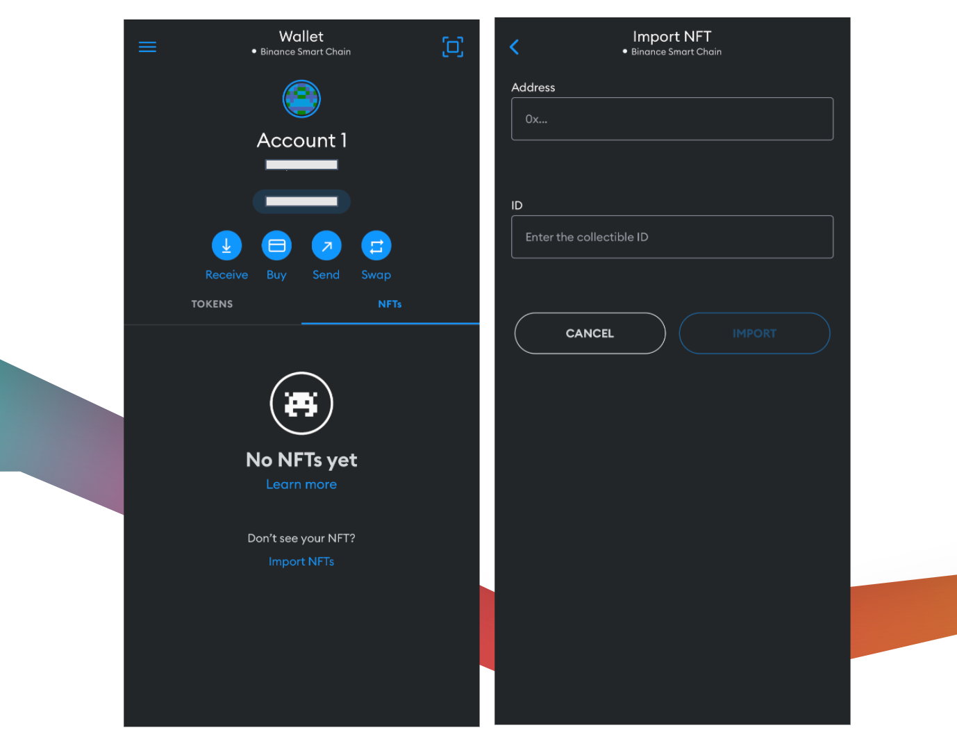 Go to your MetaMask app or wallet extension. For the Mobile App version, click on the NFTs tab and click ‘Import NFTs’ at the bottom of the screen. For the wallet extension version, click on the Assets tab and click ‘Import Tokens’ at the bottom of the screen.